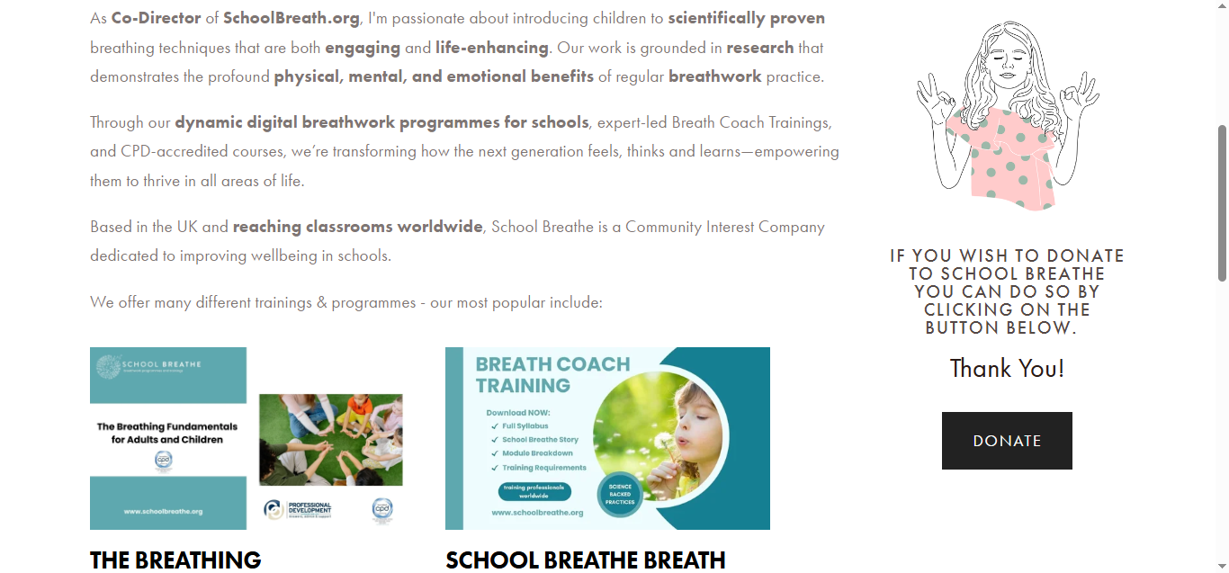 I was contacted again by the team at Breath Gal again in July 2025 as they needed some more updates to their site. I reworked the School Breathe page and added content to the merchanise page being sure to keep the style in line with the rest of their site.