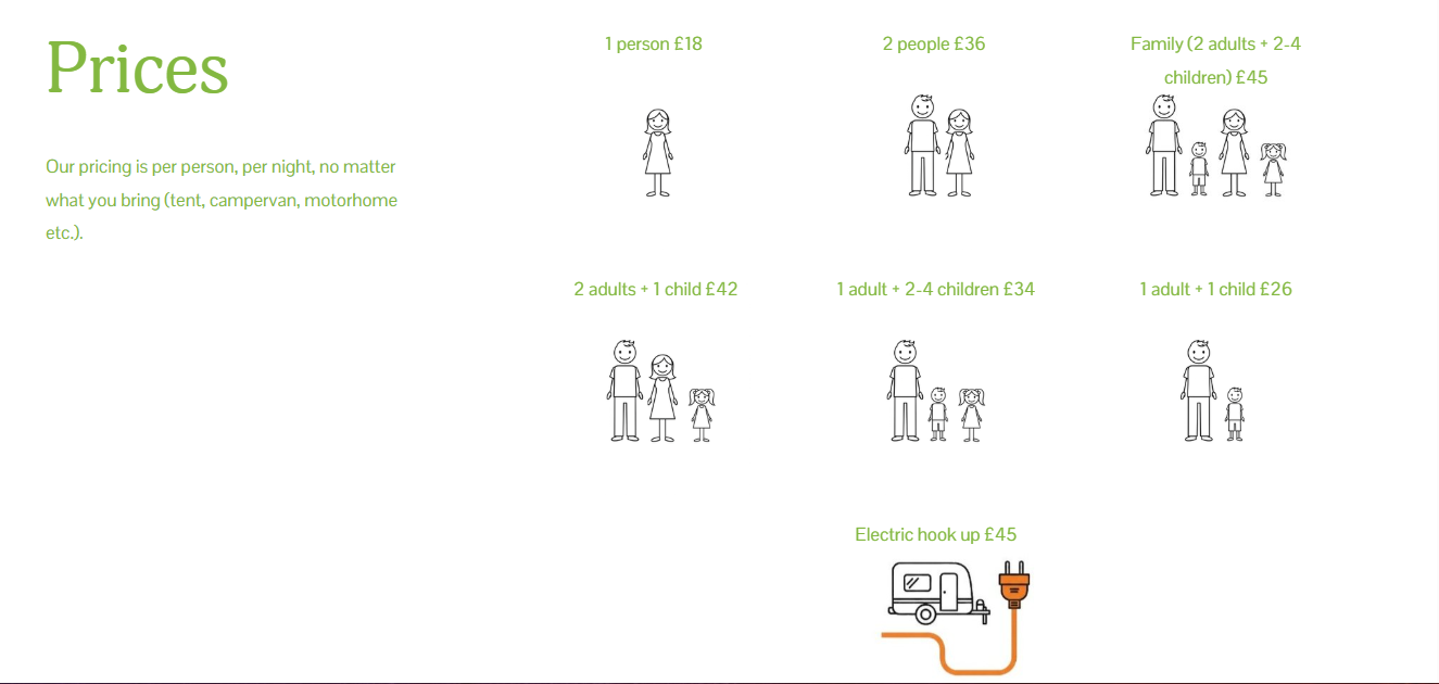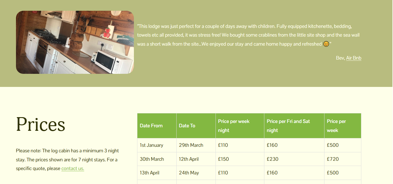The site has individual pages for camping, caravans, log cabins and cottages which includes the prices for each of these as well as frequently asked questions and high quality images.