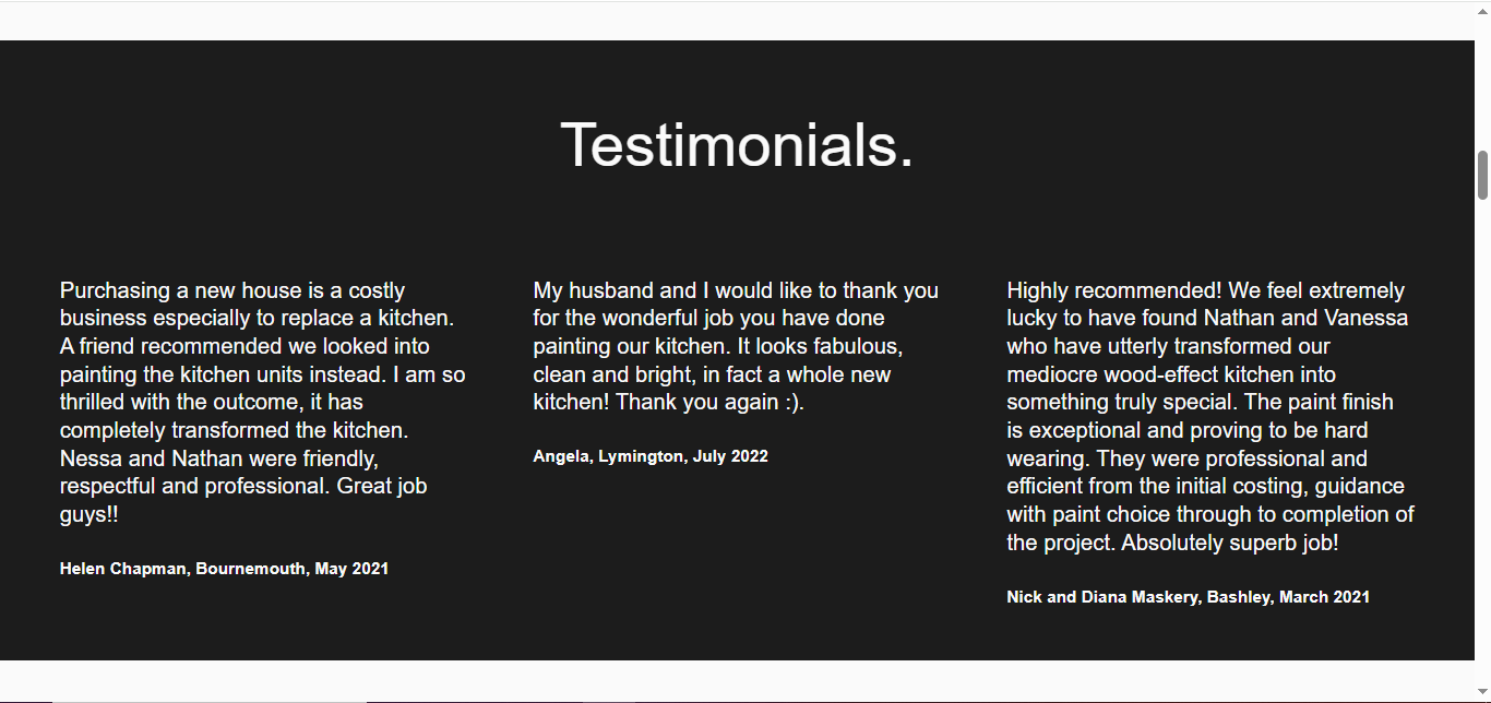 The site uses their black and white colour scheme to tastefully display past client work and answer common questions they recieve. Dotted throughout the site is many of their excellent customer reviews and images of their work. I really enjoyed working with Vanessa and feel confident she will update the site easily in the future with the use of her fully personalised user guide.